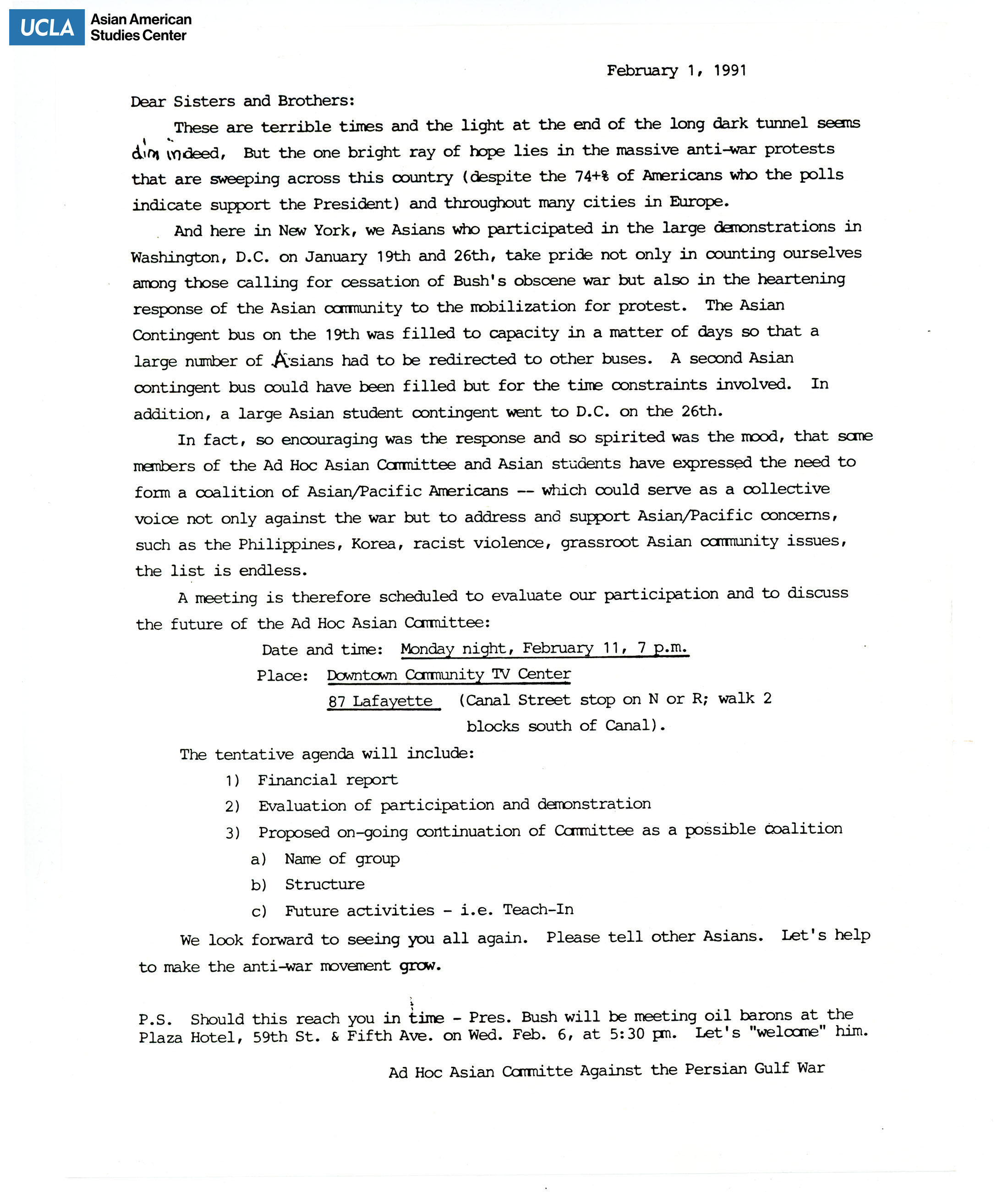 Agenda Meeting with Asian/Pacific Islanders Against the War, February 20, 1991